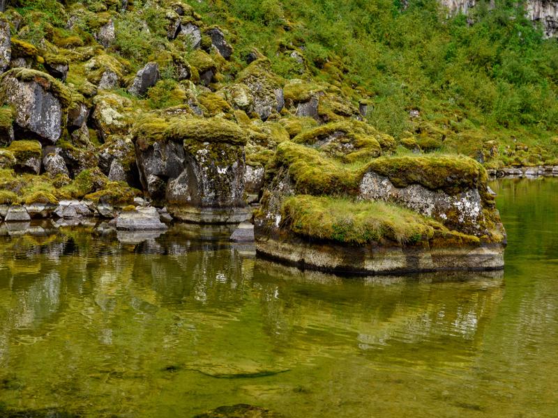 At the head of the canyon, a flat trail to a small pond, Botnstjorn, which is the remains of the deep plunge pool of a waterfall that used to fall over the cliff face. Today, the river course lies east of here.
