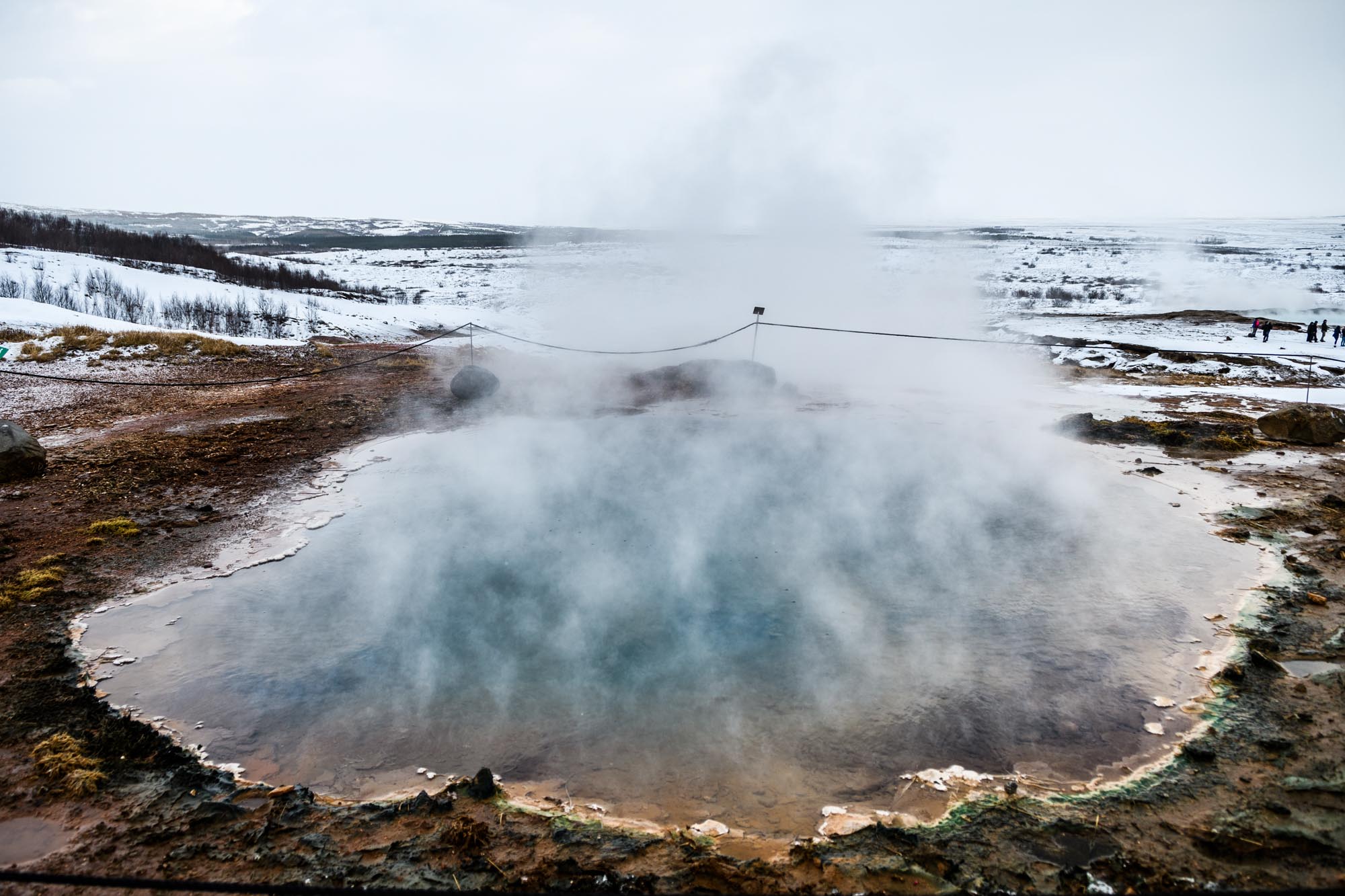 You can walk to the top of the hill behind Geysir for a wider view of the site. Unless you want a hot shower, stand upwind of the geyser and for your own safety don’t cross the rope barriers and please don’t throw coins or anything else into the hot springs.