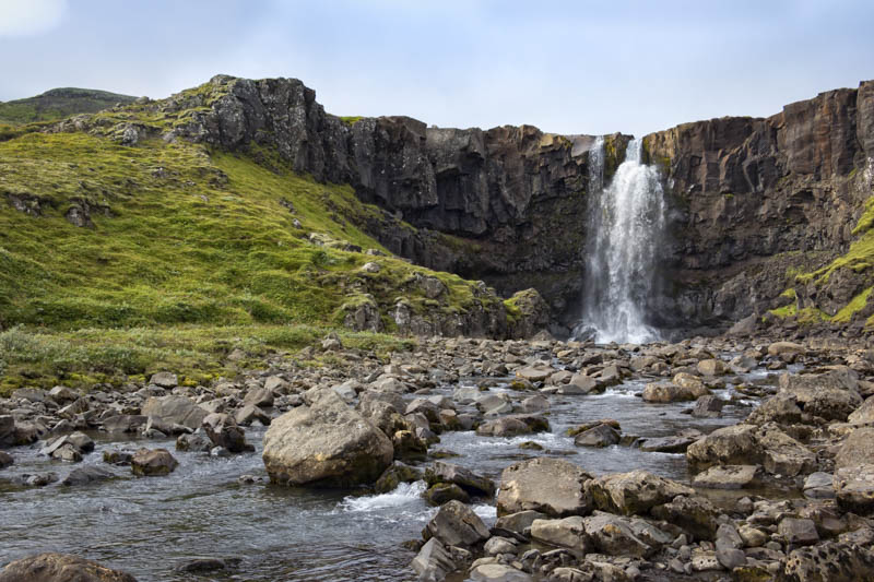 Gufufoss translates at 'Spray Falls' and in the spring melt, the waterfall churns up a significant cloud of fine mist. The waterfall is best viewed in the early morning when the sun hits it full on.