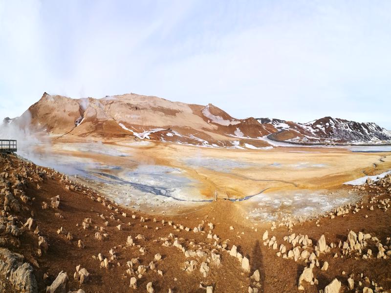 If you have time, take the path from the mud pools to the ridge of the mountain, (a 20-30 minute climb) from where you can look down over the site and enjoy a view of the Lake Myvatn area.