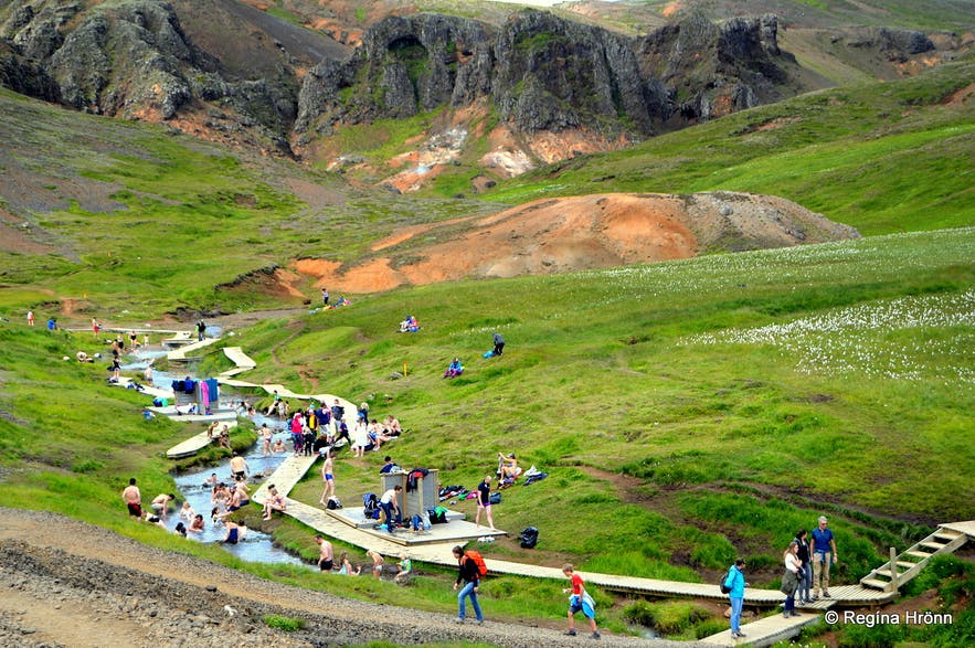 Reykjadalur (Steamy Valley) lies north of Hveragerdi. This lush green valley is peppered with hot springs set among the colorful mountains behind the town.