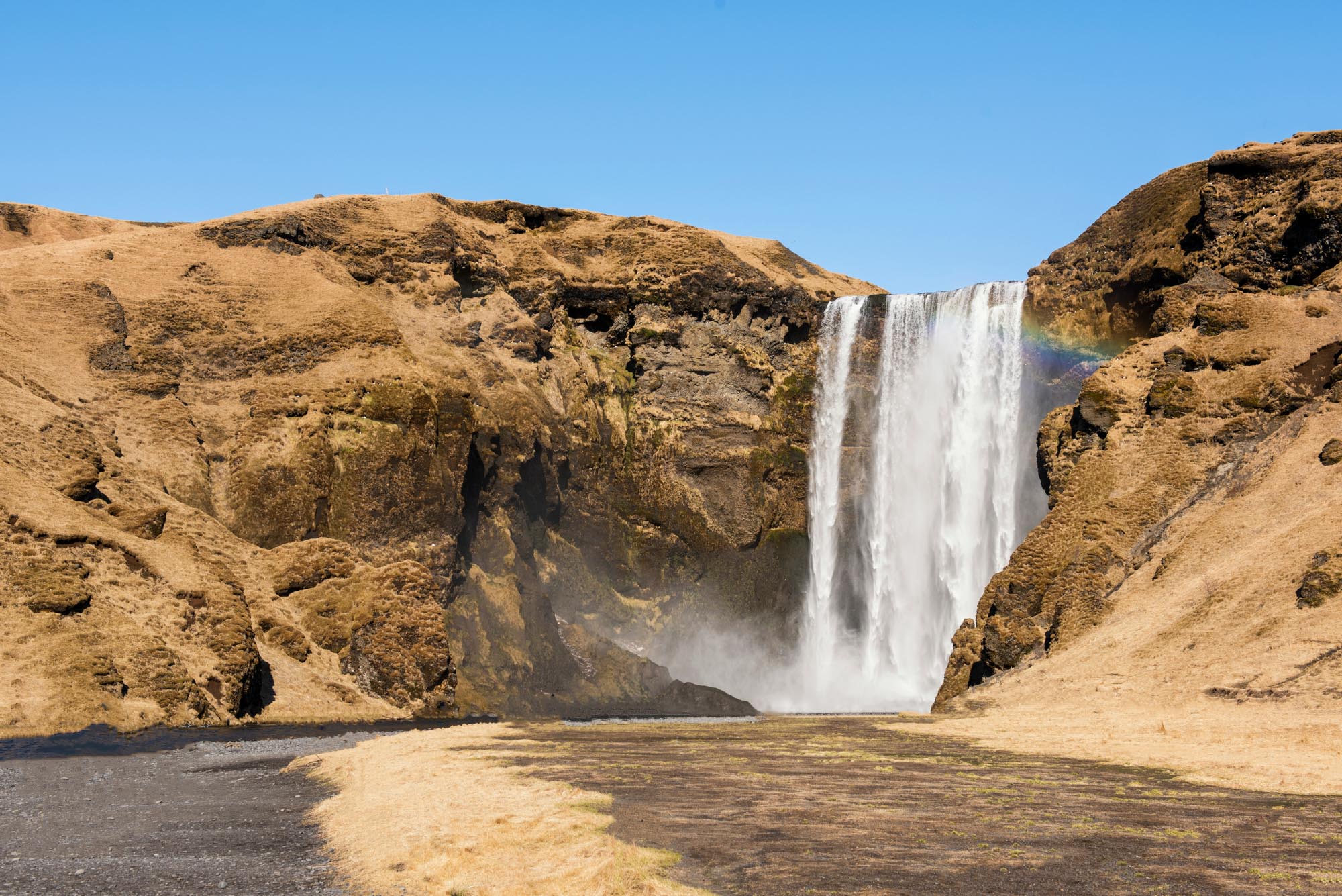 Skogafoss, 60m high and 25m wide, is the most impressive waterfall on the south coast and forms a splendid shimmering curtain of water.