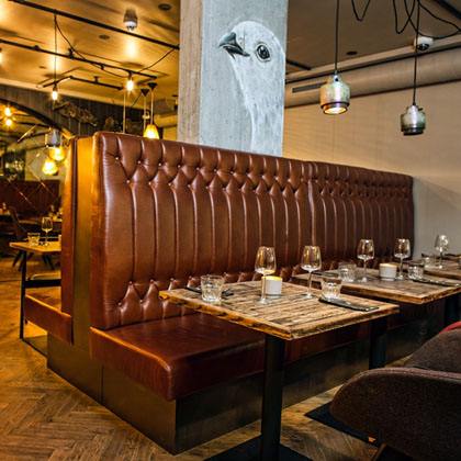 The restaurants are on two floors with an open kitchen and a wieldy bar. The restaurant is divided into spaces with cosy leather couches and has a variety of different table settings. The cuisine is feel-good comfort food with a twist on classic cuisine.